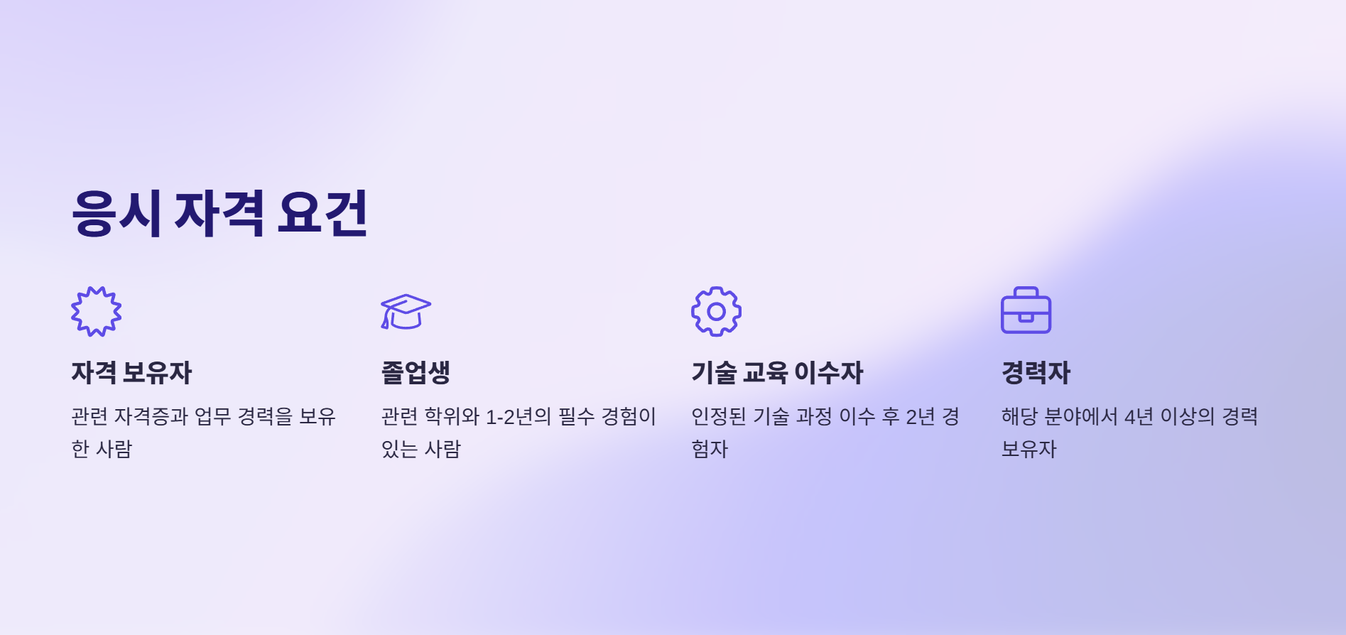 산업기사 이상의 자격 취득 후 실무 경력 1년 이상 기능사 이상의 자격 취득 후 실무 경력 3년 이상 타 분야 기사 자격 보유자